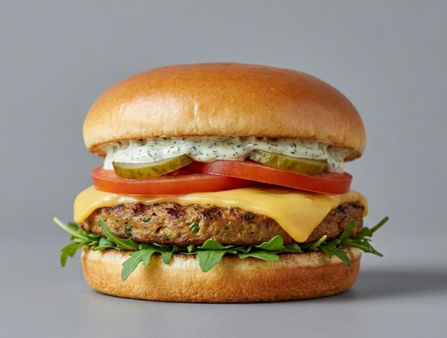 Bun's brioché du boulanger, 1 steak a base de protéines de pois, cheedar végétarien, roquette, sauce crémeuse au fines herbes, tomate, pickles.